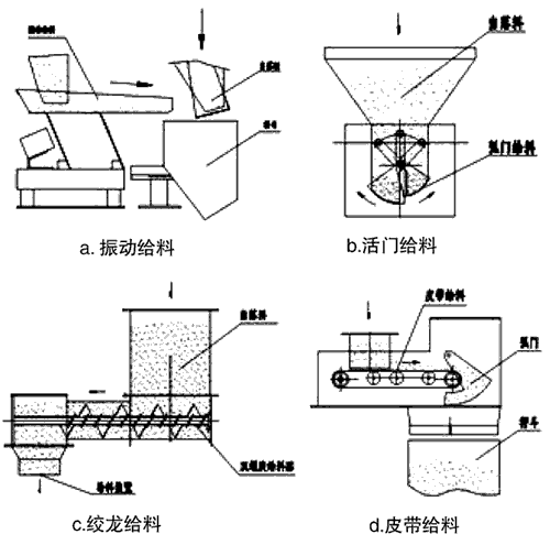 圖1中一部分也可以根據物料特性相互結合起來使用,通過在各種給料結構上采取相應措施產生符合要求的粗細給料組合,例如利用振動和活門給料結合,利用給料槽的不同尺寸,利用絞龍或皮帶電機的不同速度等。 其中給料裝置結構形式較多,主要有:電磁(電機)振動式、重力(活門或插板)式、螺旋(絞龍)推進式、皮帶輸送式、強流給料等。